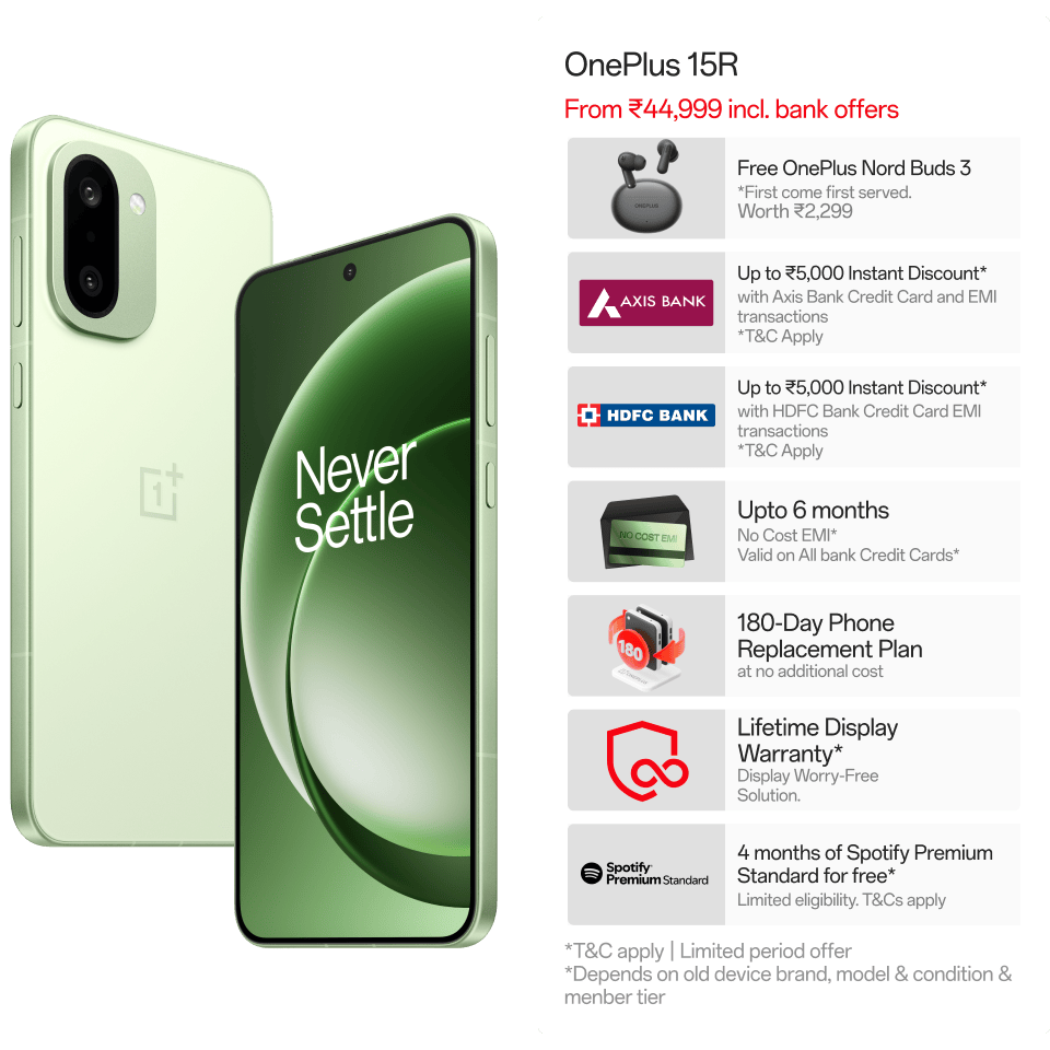 कंपनी Axis Bank और HDFC Bank कार्ड पर खास डिस्काउंट भी दे रही है, जिसके बाद इसकी प्रभावी शुरुआती कीमत घटकर 44,999 रुपये तक आ सकती है. OnePlus 15R को Charcoal Black, Mint Breeze और Electric Violet कलर ऑप्शन्स में खरीदा जा सकता है.