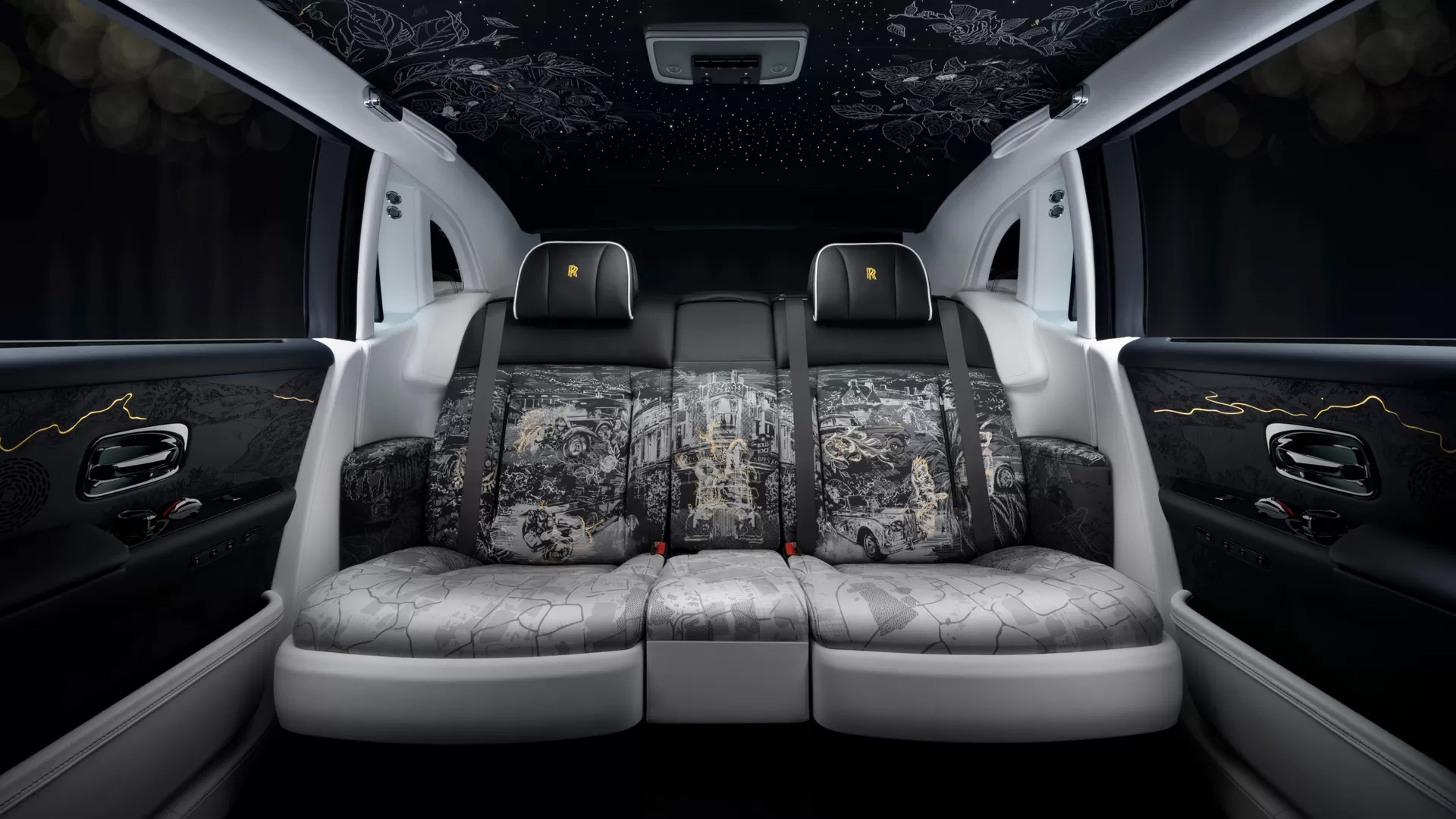 Phantom Centenary Collection का इंटीरियर हैंडक्राफ्टेड गोल्ड एम्ब्रॉयडरी और हाई-रिज़ॉल्यूशन फैब्रिक डिज़ाइनों से सजा हुआ है.
